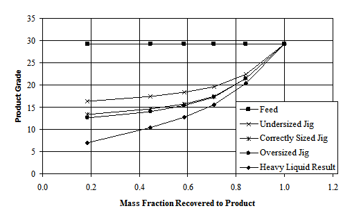 One of the main features of ASTRAD is the ability to determine improvements in jig yield as a function of jig size and feed rate which permits an economically optimum jig size to be selected. It can also determine the range of yields achievable over an ore body which has a variable but known washability (density distribution).